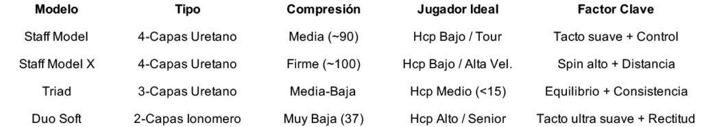 - Staff Model (La «Suave»): Con una compresión media (entorno a 90), esta bola está diseñada para quien busca esa sensación «mantecosa» en el impacto sin sacrificar velocidad.