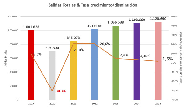 Como se aprecia en el gráfico, las salidas globales han superado por 4º año consecutivo el millón de rondas, incrementándose sin parar desde el 2020 y superando ampliamente las de 2019 (año pre covid) lo que consolida el crecimiento y tendencia alcista del destino.