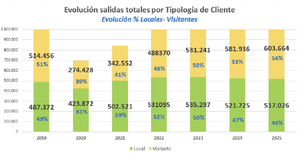 Segmentando los datos por tipología de clientes, se observa que las salidas de jugadores visitantes han experimentado un incremento de más de 21.500 GFs adicionales este año y representan ya un 54% del total de salidas del destino superando las 603.500 rondas, mientras que las de jugadores locales (socios y abonados) tienen una tendencia regresiva.